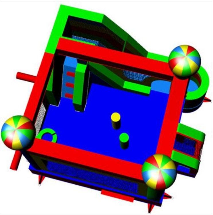 Features: Can be used wet/dry, pop-up obstacles, bounce house, basketball hoop, and a no need to exit design.