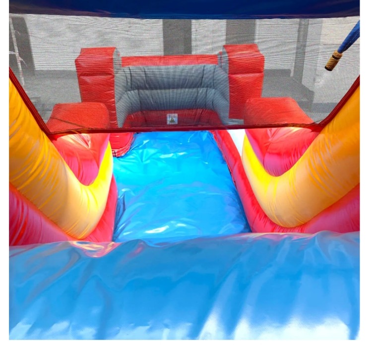 Features: Can be used wet/dry, single lane slide, bounce house, and basketball hoop.